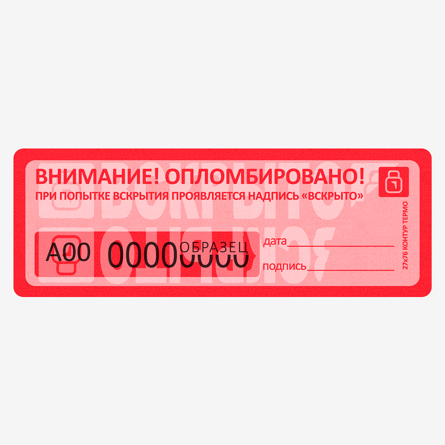 Самоклеящаяся номерная пломбировочная наклейка на специальной подложке.  Изготовлена из полиэстера с высокоадгезивным клеевым слоем.  При попытке отклеивания от пломбируемой поверхности на самой поверхности и на наклейке проявляются надписи "ВСКРЫТО" и значок производителя, не исчезающие при повторном наклеивании.  Воздействие на наклейку высокой температурой приводит к необратимому потемнению изделия, что служит дополнительной защитой.  Каждая наклейка имеет нестираемый индивидуальный номер.  При отклеивании наклейки, номер остаётся на поверхности.  Наклейка содержит поля "дата" и "подпись". Идеально подходит для пломбирования любых чистых поверхностей.