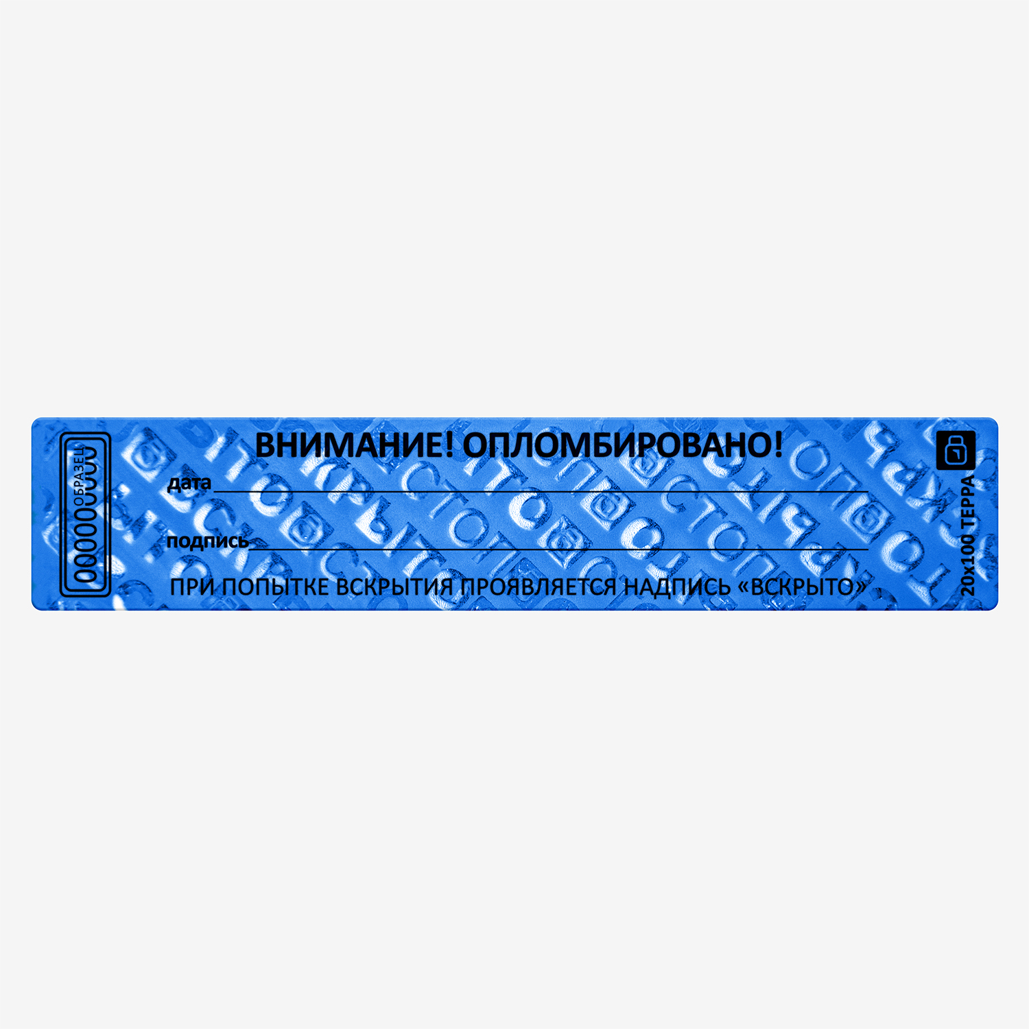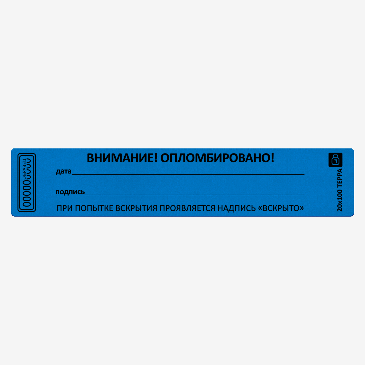 Самоклеящаяся номерная пломбировочная наклейка на специальной подложке. Изготовлена из полиэстера с высокоадгезивным клеевым слоем. При попытке отклеивания от на поверхности проявляются надписи "ВСКРЫТО" и значок производителя, не исчезающие при повторном наклеивании.  Наклейка содержит поля "дата" и "подпись". Идеально подходит для пломбирования любых чистых поверхностей.