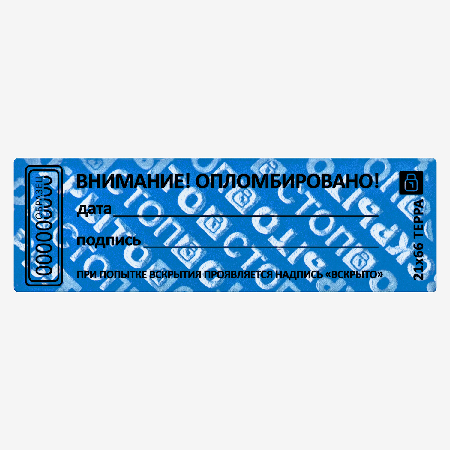 Самоклеящаяся номерная пломбировочная наклейка на специальной подложке. Изготовлена из полиэстера с высокоадгезивным клеевым слоем. При попытке отклеивания от на поверхности проявляются надписи "ВСКРЫТО" и значок производителя, не исчезающие при повторном наклеивании.  Наклейка содержит поля "дата" и "подпись". Идеально подходит для пломбирования любых чистых поверхностей.