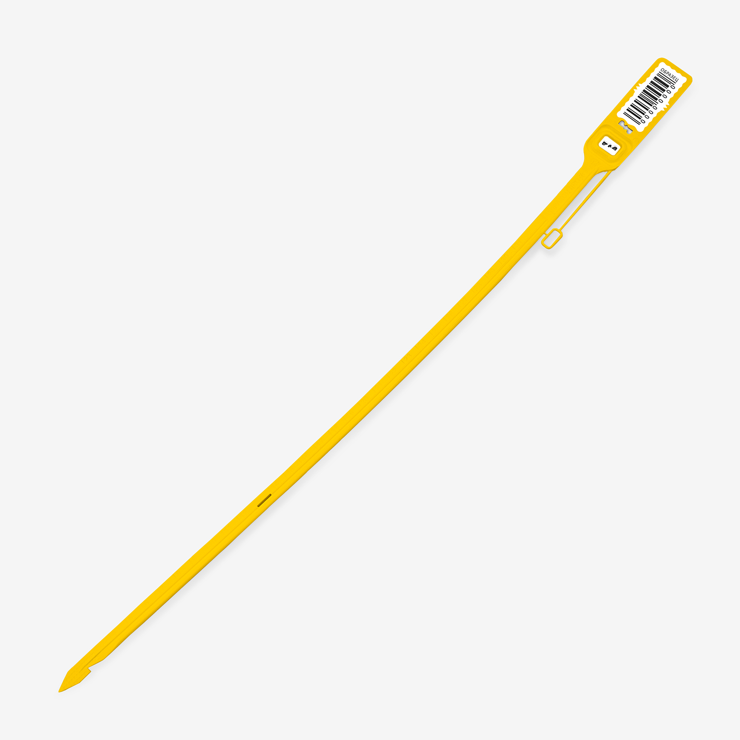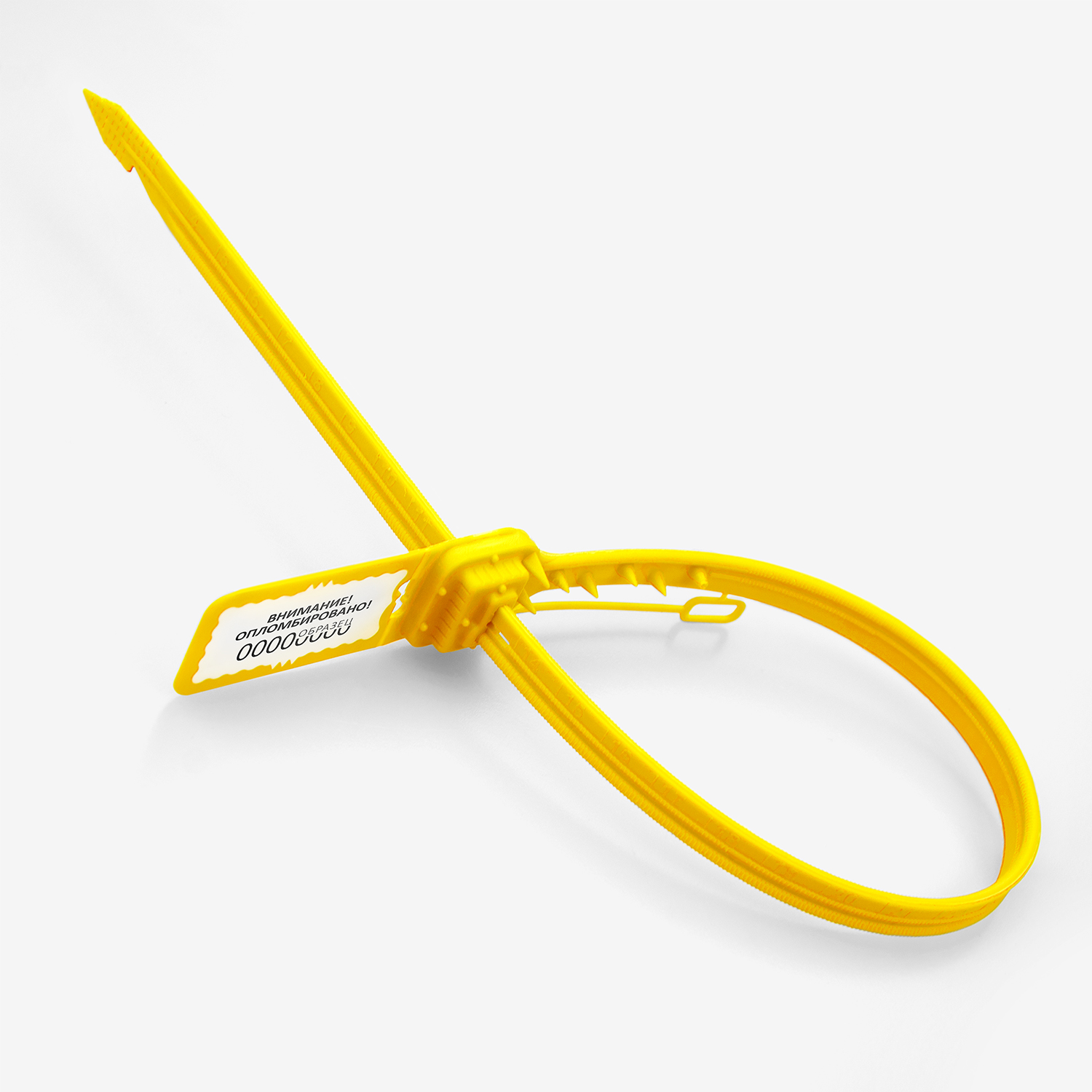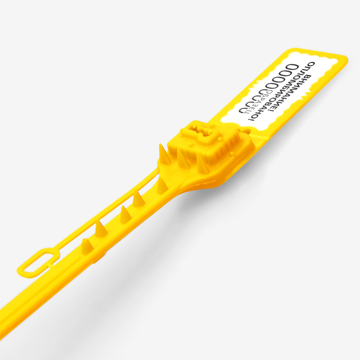 Мешковая пломба с рабочей длиной 374 мм.  Изготовлена по технологии двуцветного литья, что позволяет наносить защищённую лазерную маркировку на пломбы любого цвета.  Замок-вставка изготовлен из нержавеющей стали.  Пломба имеет 8 прочных, острых, длинных шипов, которые обеспечивают прочное крепление пломбы на любых типах мешков.  Гибкий элемент пломбы имеет усиленную конструкцию и острый, прочный наконечник для прокалывания мешков.  Специальный гибкий элемент с линейкой позволяет надежно защитить пломбу от попытки вскрытия даже без затягивания.  Пломба имеет многоуровневую систему защиту от вскрытия и подделки.