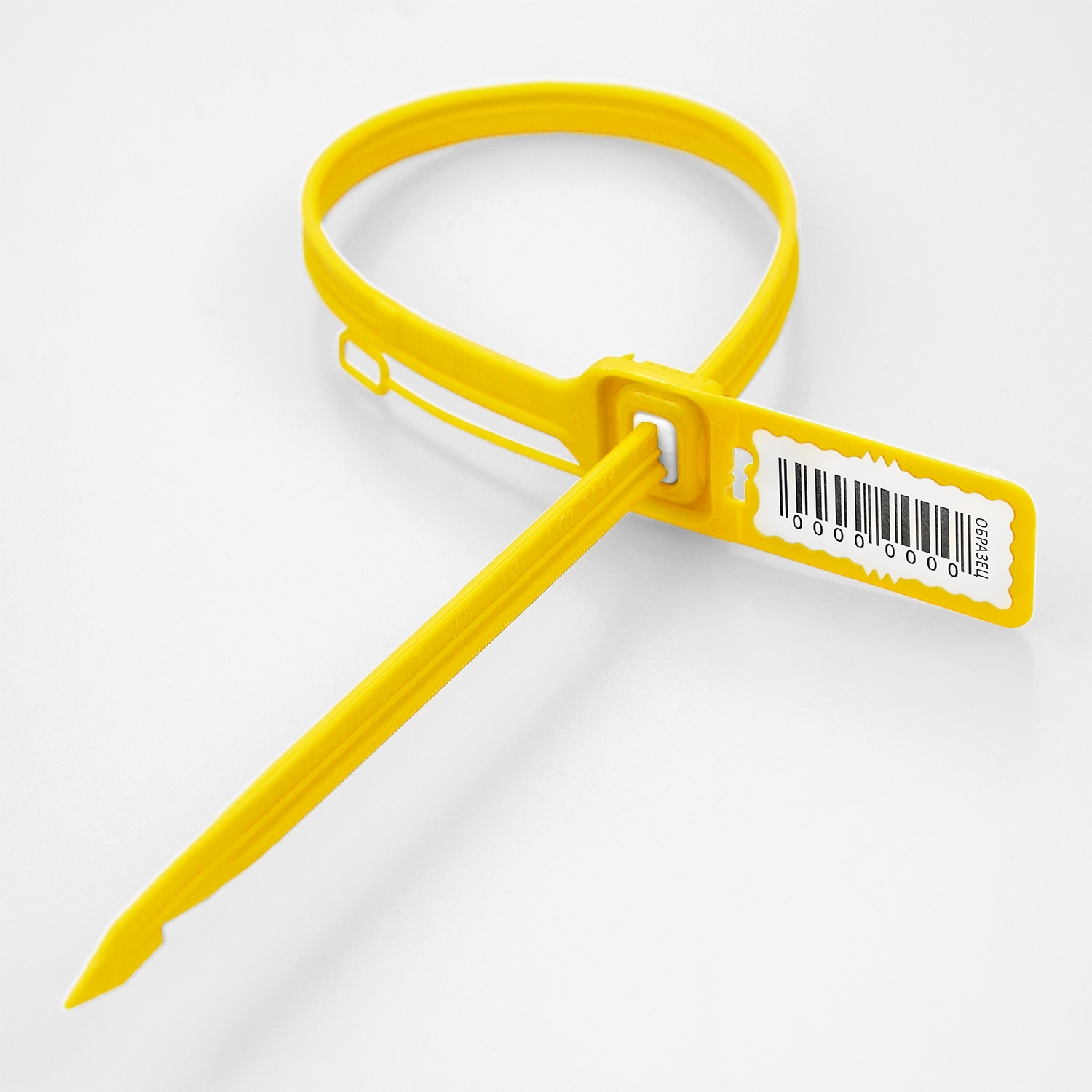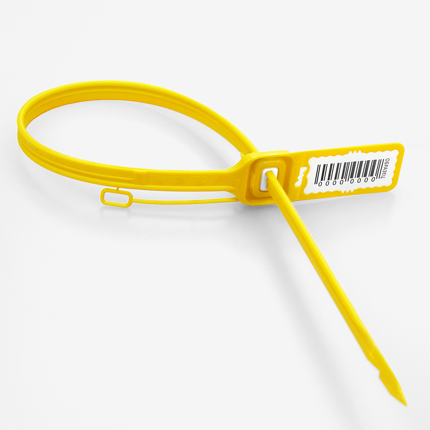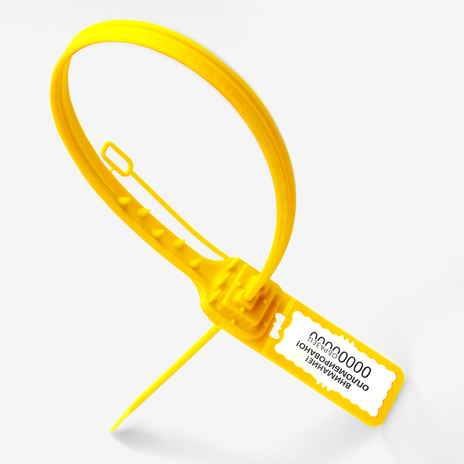 Мешковая пломба с рабочей длиной 374 мм.  Изготовлена по технологии двуцветного литья, что позволяет наносить защищённую лазерную маркировку на пломбы любого цвета.  Замок-вставка изготовлен из нержавеющей стали.  Пломба имеет 8 прочных, острых, длинных шипов, которые обеспечивают прочное крепление пломбы на любых типах мешков.  Гибкий элемент пломбы имеет усиленную конструкцию и острый, прочный наконечник для прокалывания мешков.  Специальный гибкий элемент с линейкой позволяет надежно защитить пломбу от попытки вскрытия даже без затягивания.  Пломба имеет многоуровневую систему защиту от вскрытия и подделки.